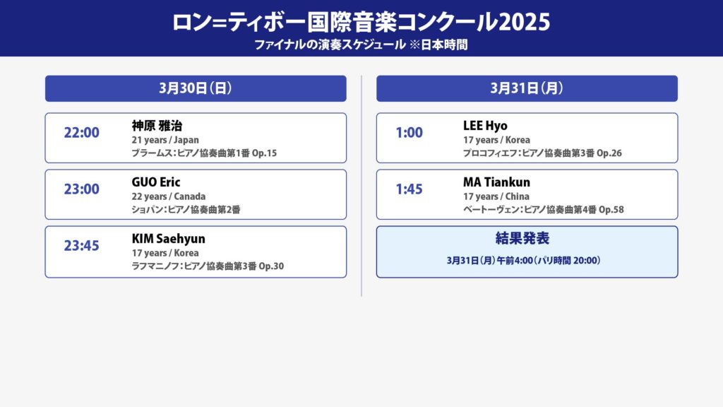 ファイナリストの演奏スケジュールと演奏曲は次のとおりです。