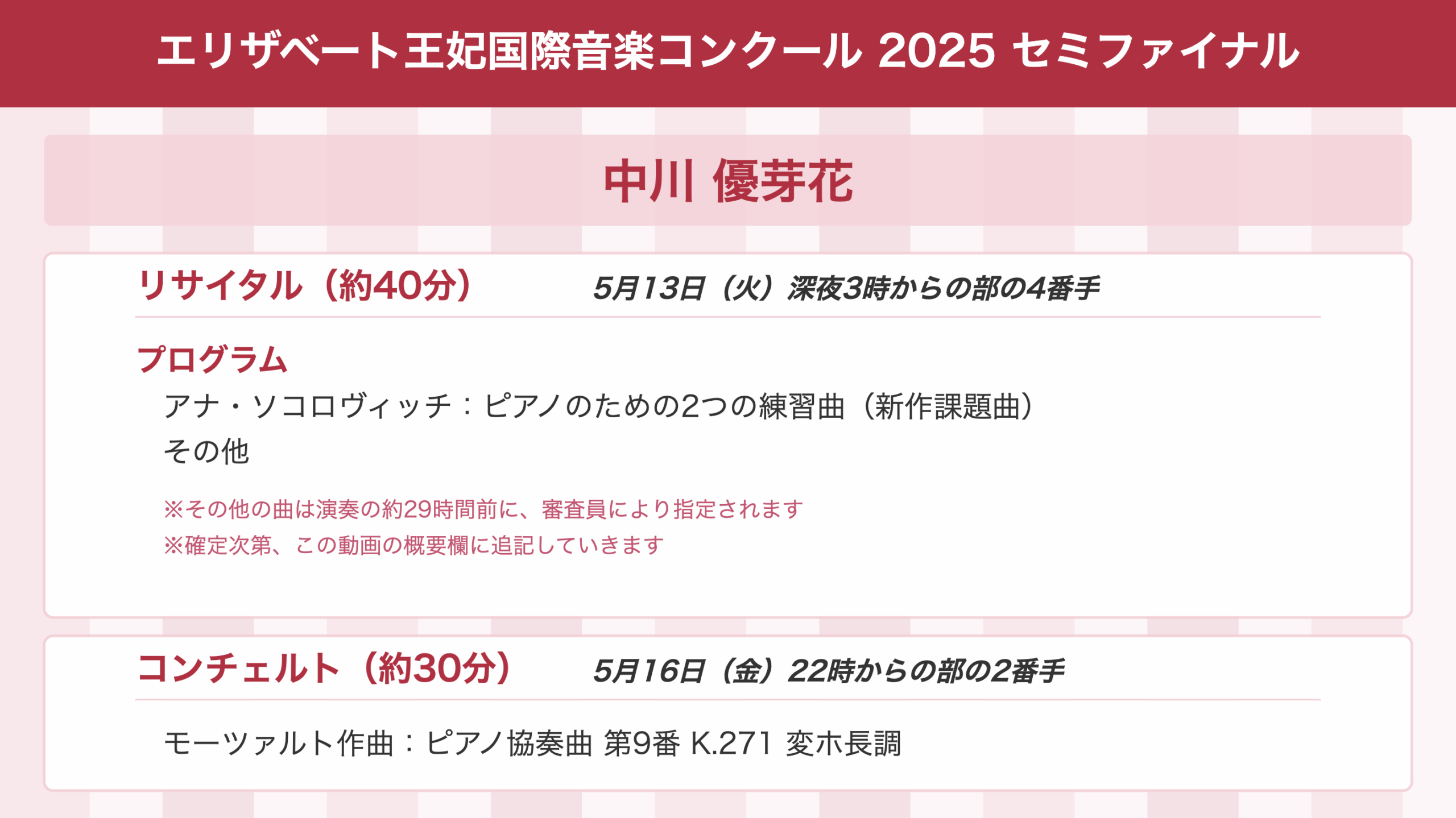 他のピアニストの方も同様ですが、リサイタルプログラムの「その他」は、演奏の約29時間前に審査員により指定されます。
