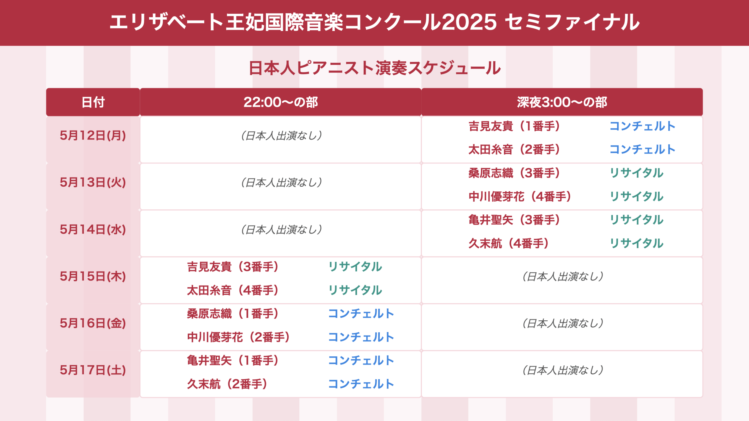 それでは、日本人ピアニストの演奏スケジュールと演奏曲を確認していきましょう。