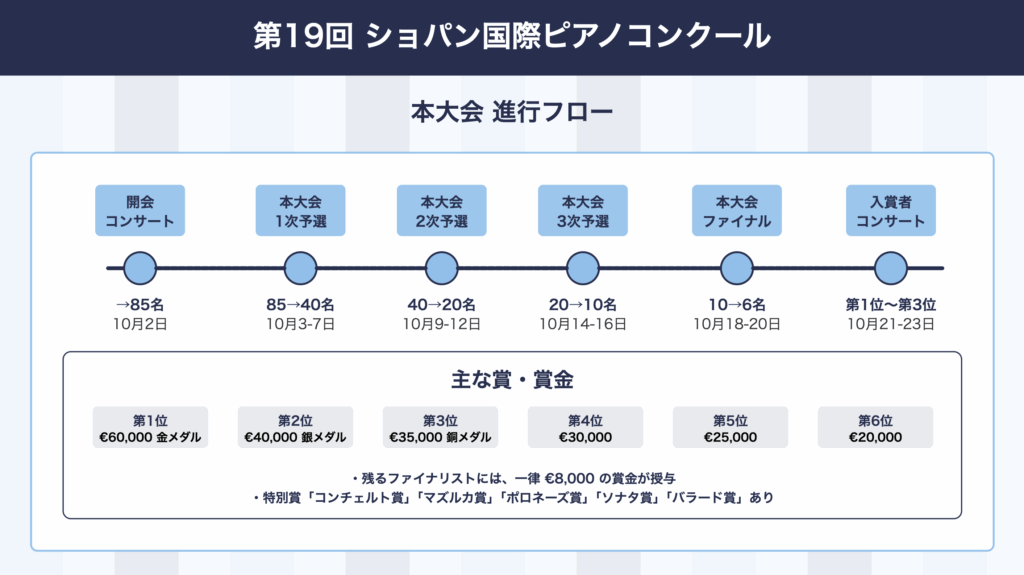 5日間にわたって繰り広げられる熱戦は、ショパン国際ピアノコンクールの公式YouTubeチャンネルでライブ配信されます。