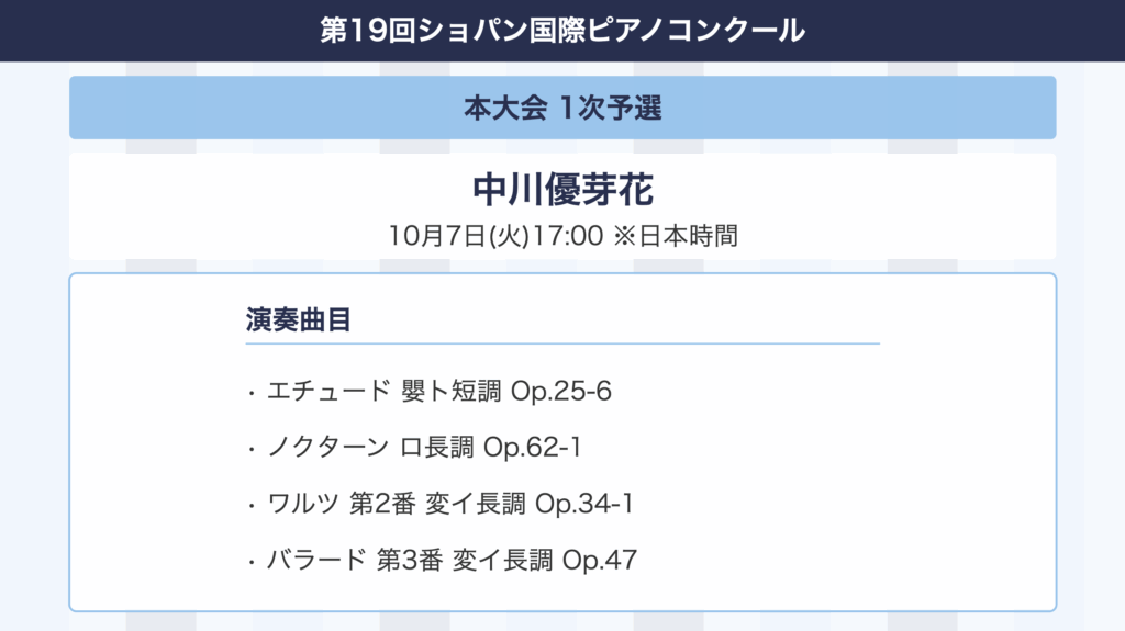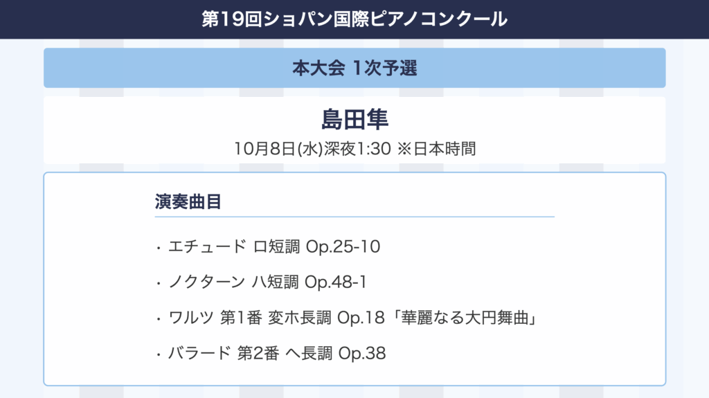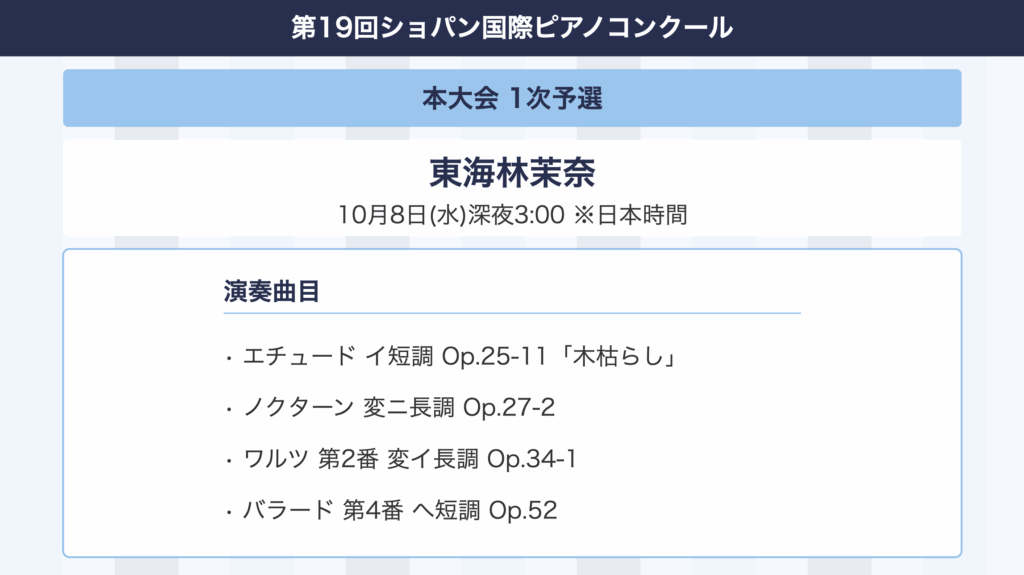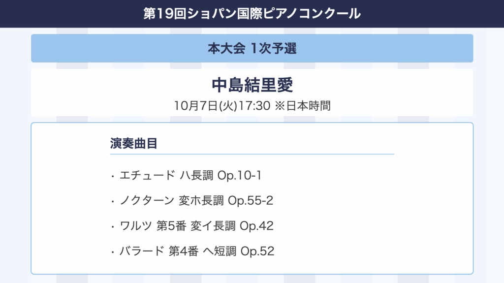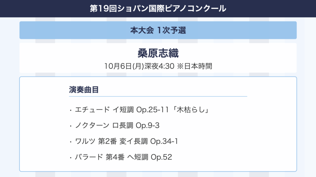 以上、日本人ピアニスト13名の本大会1次予選の演奏スケジュールと演奏曲の情報をお届けしました。