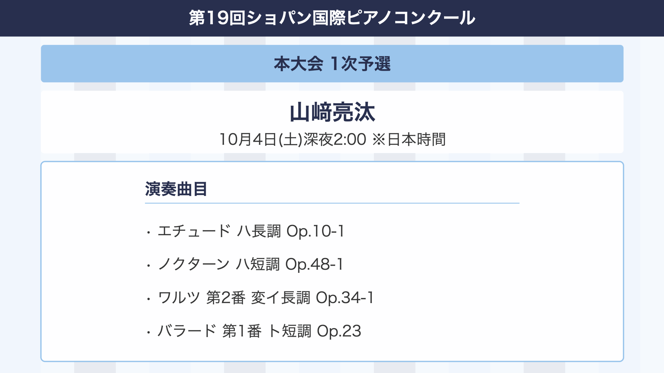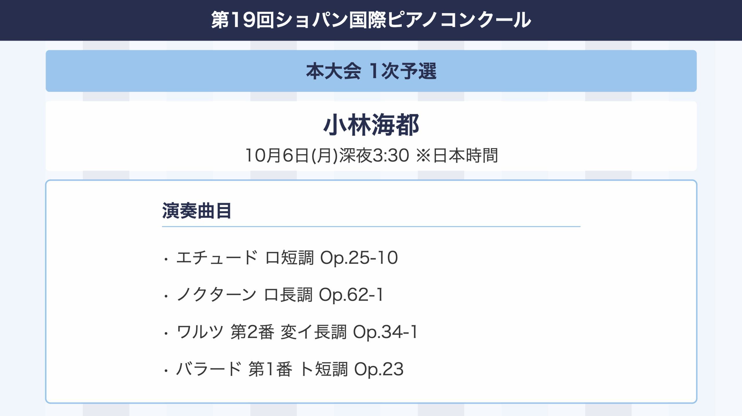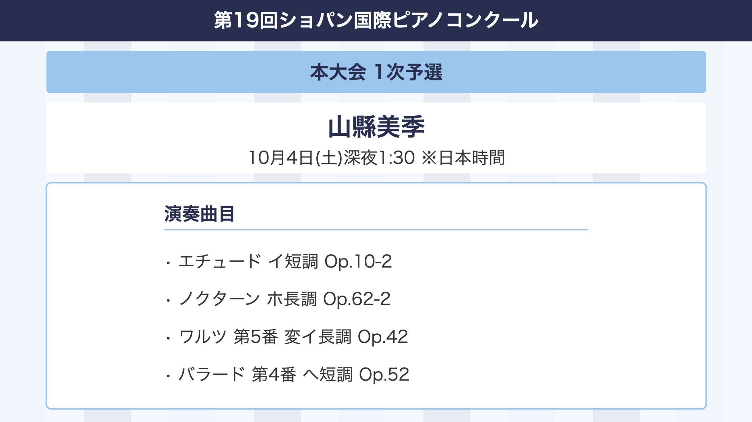 以上、日本人ピアニスト13名の本大会1次予選の演奏スケジュールと演奏曲の情報をお届けしました。
